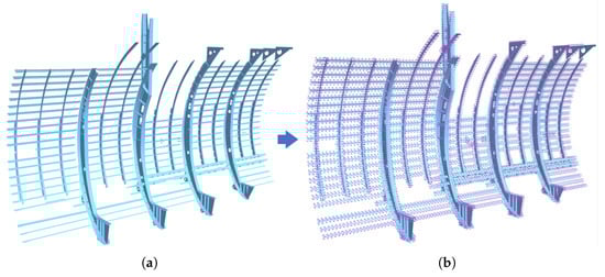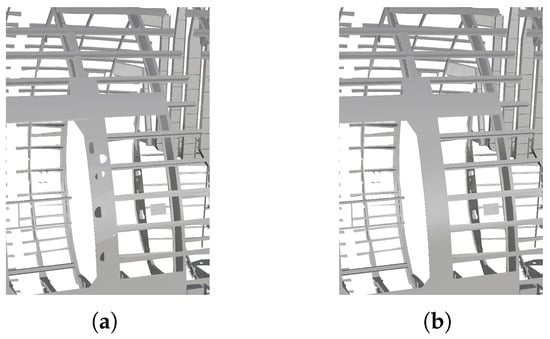 Model Pre-processing: The fuselage model contains complex structures, including grooves, chamfers, bulkhead holes, and frame stringers, which often exhibit defects. These complex features not only increase the model’s size but also complicate geometric analysis and rendering time. Therefore, this paper focuses on repairing and simplifying the model. Additionally, a collision detection system is implemented in the pre-processing phase.