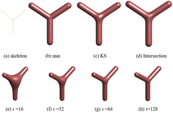 where controls the magnitude of adjustment and by default a is set to a small positive value of 10 to avoid a singular global stiffness matrix. The different structures obtained using the maximum function and KS function are shown in Figure 9. It should be noted that we used the region where both in simulation and manufacturing, instead of the geometric union of the beam, as shown in Figure 8.