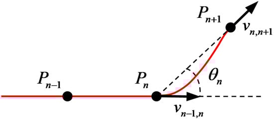 The evaluation of the bending radius mainly follows the minimum bending radius of the cable in the wiring process requirements as the evaluation standard. Only when the geometric bending radius of the current path is greater than the minimum bending radius standard can the state transition of the next node be allowed. A third-order NURBS curve is fitted as the centerline geometry of the cable segment between points and , using the path directions of the two points as the endpoints of the vector direction, as shown in Figure 10.