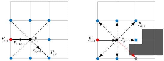 Our considerations behind the above settings are further explained below. They consist of two different cases. First, according to the principles of cable harness design and equipment arrangement on board, it is necessary to follow the principle of straight-line wiring. When the corner is , it can be regarded as approximately straight line wiring in space path direction at point , which is the same as the path direction at point , and takes the maximum value. When the turning angle is greater than , the cable bends and the bending radius of the cable path is likely to be less than the minimum bending radius. In this case, the corresponding value should be the minimum value. Second, when cable turning cannot be avoided, priority should be given to selecting the path points within the range of for turning angle. The corresponding value of is greater than that when the turning angle is within the range of . The larger the value of when excessive bending does not occur, the greater its impact on the heuristic function, and in subsequent iterations, the path search is more biased towards selecting path points with straight or near-right angle turns.