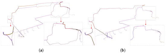 To verify the effectiveness of the method for dealing with closed loops described in the article, the spatial layout of the wiring harness was initially designed based on the objective function, as shown in Figure 23a. During the process of combining multiple cable paths in the wiring harness into a bundle, there exist situations where local branching forms closed loops. Subsequently, based on the overall loop processing flow, corresponding loop branch merging schemes were identified based on the types of elements within the loop. The cost of wire length, turning, and bundling in the merged loop is calculated, and an optimized solution for loop processing and branch merging is obtained with the lowest overall process cost. The optimization process results in an optimized layout of the multi-branch wiring harness, as shown in Figure 23b.