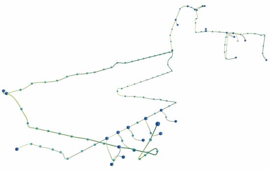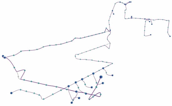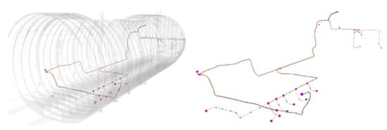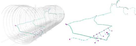 An A*–ant colony cable layout was planned according to Formula (34), and the result in Figure 26 was obtained. Comparing Figure 24 with Figure 26, one can find that the cable in Figure 26 is more bent. In Figure 24, the degree of cable bending is small, and the wiring harness is as close as possible to the aircraft metal structure wiring. This is because the algorithm takes the clamp capacity evaluation function into account when finding the way between adjacent nodes. The algorithm in this paper takes into account the installation requirements of supporting structural parts’ layout spacing and specification capacity, reduces the degree of cable bending, and effectively improves the layout effect of multi-branch wiring harnesses.