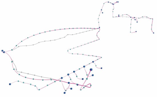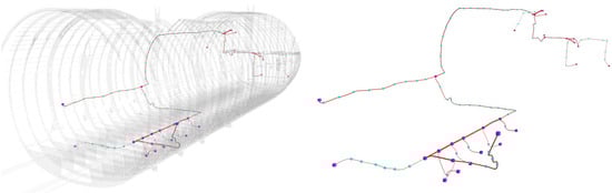 An A*–ant colony cable layout was planned according to Formula (35), and the result in Figure 27 was obtained. Comparing Figure 24 with Figure 27, one can find that the cables in Figure 27 are bound at more branch points. In Figure 24, cables are bound at fewer branch points. This is because the bundling node evaluation function is taken into account in the routing between adjacent nodes. The algorithm in this paper uses as many duplicate nodes as path points as possible when laying each cable, reduces the bundling of cables, and improves the layout effect of multi-branch wiring harnesses effectively.