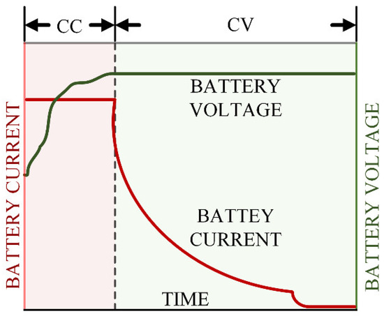 In recent decades, the number of vehicles with internal combustion engines (ICE) on the road around the world has seen explosive growth [1,2,3]. However, the extensive use of fossil fuels and the emission of pollutant gas deteriorates numerous damages to the environment and human society. In this background, the application of electrical vehicles (EVs) and electrical bikes (EBs) has been particularly supported by many policymakers and governments for their environmental friendliness [4,5]. It is predicted that there will be 500 million passenger EVs and many more EBs worldwide by 2040 [6]. As EVs and EBs rely on electric energy stored in batteries, battery chargers have become a focus of many institutions. A high-performance rechargeable lithium-ion battery is currently identified as a suitable and competitive candidate for EVs and EBs nowadays and its typical charging profile is depicted in Figure 1. Typically, the charging process can be divided into two charging stages [7]: first, the constant current (CC) charging stage; second, the constant voltage (CV) charging stage, meanwhile, the battery equivalent resistance is also variable during the charging process. Nevertheless, the common battery chargers can mostly charge the battery with the constant output current or voltage, which will not only shorten the battery life and compromise cycle life but also affect the safety and performance of batteries [8,9]. To address these issues, it is essential to design a battery charger that can respond to the battery’s characteristics by altering the CC or CV output mode and maintaining high conversion efficiency across a wide range of load resistances.