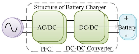 As shown in Figure 2, the common rechargeable battery chargers are composed of two basic parts [10]: an ac-dc converter with power factor correction (PFC) function part and a dc-dc resonant converter part widely used to modulate the output of the battery chargers. Thus, the dc-dc converter is the key to the battery chargers. Among the many topologies of the dc-dc converters, the LLC topology is a popular candidate for dc-dc converter by means of the inherent advantages, such as zero-voltage-switching (ZVS) for MOSFETs of the inverter, zero-current-switching (ZCS) for diodes of the rectifier and simple structure [11,12,13]. However, for common LLC converters which usually adopt pulse frequency modulation (PFM) control, wide load variation in battery charging can result in a wide output voltage range, which requires a corresponding wide variation range of switching frequency accordingly [14]. Nevertheless, if the switching frequency deviates from the resonant frequency, the converter will lose its zero-phase angle (ZPA) conditions and the soft switching features, resulting in increased reactive power loss and switching loss, which in turn leads to a rapid decrease in conversion efficiency. Additionally, the wide switching frequency range expands the demands on the design of transformers and gate drivers, as well as other power equipment [15]. Designing the dc-dc converters for wide load range applications, particularly those that can implement CC-CV modes and achieve high conversion efficiency for battery charging applications, can be challenging. Various technologies have been proposed to address these difficulties, which can be divided into two categories.