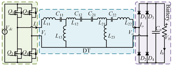 The schematic of the dc-dc converter with a DT as the resonant circuit is depicted in Figure 3. Obviously, several LC filters, such as L11 and C11, are adopted in the DT to replace the commonly used several capacitors. By replacement of the capacitors with LC filters, the total harmonic distortion (THD) will decrease. Meanwhile, the low THD also improves the accuracy of fundamental harmonic analysis (FHA), especially in CC mode [24]. In addition, the replacement is not necessary, and this paper chooses to replace LC filters for the generality of the parametric analysis. It should be noted that the above functions can be achieved in the actual design process as long as the following impedance conditions are met.