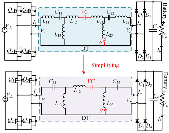According to (21), all β parameters can be zero, which means the corresponding inductors can be removed from the DT converter. Nevertheless, by analyzing (34), the β12 and β21 cannot equal zero simultaneously in order to keep the CC bigger than zero. Therefore, the DT converter can be simplified as shown in Figure 8. These two design options are equivalent when analyzed with FHA and can be chosen based on varying application scenarios and requirements. The simplified DT circuit can be selected to meet specifications such as power density, volume, and weight. Conversely, the circuit topology that preserves inductance can be chosen for conditions that require sensitivity to high-frequency components within the resonant tank.
