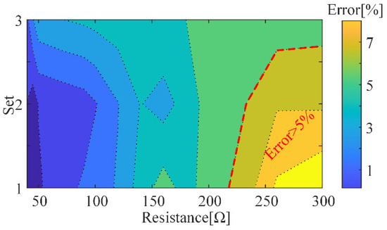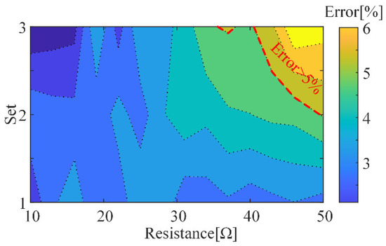 In addition, the load-independent ability can be expressed in terms of the relative error between the experimental current value and the theoretical current value, and the closer the relative error is to zero, the greater the load-independent ability of the proposed system under the CC mode is. The relative error is depicted in Figure 11. According to Figure 11, the relative error is approximately less than 5% in the whole range of experimental load during set one in lower current value. Furthermore, as the load resistance and output current increase, there is a slight increase in relative error.