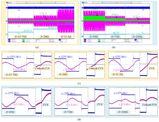 Figure 13a shows the transient state of the DT converter in CC output mode. In Figure 13a, the charging voltage ub increases from 20.93 V to 30.26 V, then to 47.60 V, accordingly to the load resistance increases, while the charging current ib nearly remains the same value 1.52 A. At the same time, the input voltage ui and the control variable of DT, are not changed, which indicates the DT converter can achieve CC output mode in different loads without control. Then Figure 13c shows the steady-state of the CC mode in three different loads, with increasing resistances 13.75 Ω, 20 Ω, and 31.5Ω, the phase of input current gradually lags behind the input voltage, and the switch of the inverter changes from critical-ZVS to ZVS. Therefore, the switching loss is reduced and the conversion efficiency of the CC output mode improves by degrees.