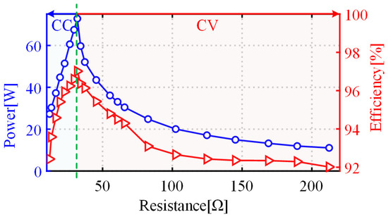Due to the CC mode mainly operating under the initial stage of battery charging, when the internal resistance of the battery is low. Thus, in order to simulate this charging condition, the experimented load is set to range from 9 Ω to 50 Ω. Three sets of data are obtained by configuring the input voltage to three fixed values, 48 V, 65 V, and 96 V, then varying the load resistance.