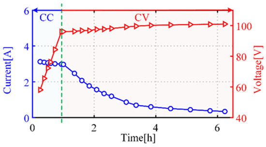 Before the experiment analysis, the battery pack conditions are presented as follows: the initial charge voltage of the battery cell is 2.2 V, the final charge voltage is 4.2 V, and a total of 24 battery cells are connected in series to form a battery pack. Furthermore, the theoretical charging current/voltage of CC/CV mode is 3.12 A and 96 V, respectively. In CC mode, the output voltage rises with the resistance of the battery pack. When the voltage reaches 96 V, the ACs turn on, and the variable capacitor changes, then the prototype accesses the CV mode until the charging current is less than 0.31 A (10% of the CC output current) finishing the charging process.