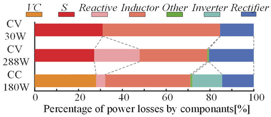 The total power loss is divided into several parts in terms of the physical structure of the DT resonant converter in Figure 18. From Figure 18, obviously, in CC output mode when the output power is 180 W, because of the DT converter under the critical-ZVS state, there are few reactive power losses and switching losses of the converter. At this point, the VC introduces additional power losses in the CC output mode. As to CV 288 W and 30 W, it is clear that the power loss of S1 only exists in this mode, and the percentage increases with the decline of the charging current, namely output power, gradually. Besides, ZVS can be achieved in most CV output modes, resulting in low switching losses. In both CC and CV output modes, the inductor power losses are the dominant losses of the DT converters, the actual value of which is determined only by the output current and the resistance of the inductors. In reality, the resistance value of the inductor always exists. Due to the parallel structure of the converter, when the load increases, the proportion of current flowing through the converter increases, resulting in an increase in the power loss of the inductor.
