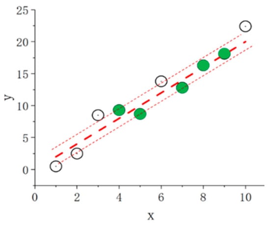 SVR is a machine learning regression method based on statistical learning theory [29]. For regression problems, the traditional approach is to calculate the error between the predicted value and the true value, measure it with the loss function, and obtain the prediction model by minimizing the loss function. The traditional linear regression method calculates the loss as long as the predicted value is not equal to the real value, and the support vector regression has a (tolerance deviation; a manually set empirical value) between the predicted value and the real value. As shown in Figure 1, the red thick dotted line is a linear function, and the distance between the two red thin dotted lines and the middle red thick dotted line is . The green circles are the samples that fall into the interval band, and the black-edge circles are the samples that fall outside the interval band, also known as the support vector. SVR creates an ‘interval band‘ on both sides of the linear function and does not calculate the loss for all samples falling into the interval band. Only the support vector has an impact on the prediction function model. Finally, the optimized model is obtained by minimizing the total loss and maximizing the interval.