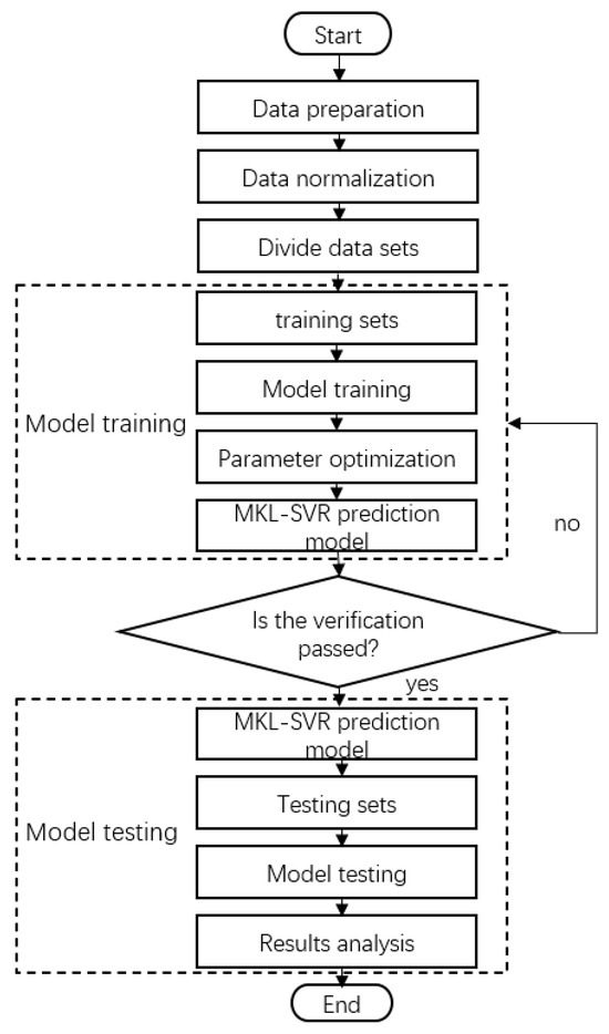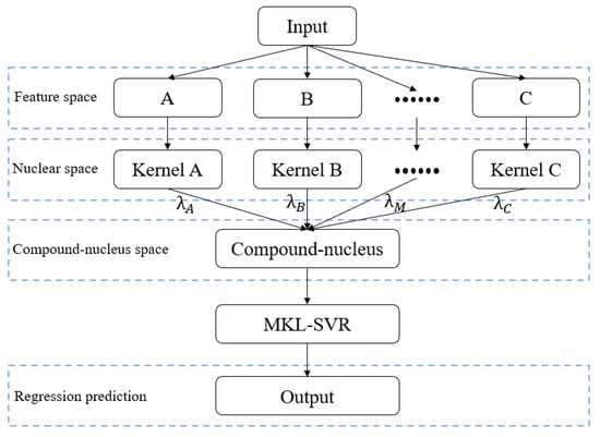 MKL is widely used in different fields as a feature selection technique. It can be a combination of different parameters of the same kernel function or a combination of different kinds of kernel functions. Each kernel function may use different features to describe the features from different data sources. Therefore, the optimization problem of the original model is transformed into the selection problem of kernel weight λ. Figure 2 shows the learning process of the MKL-SVR model.