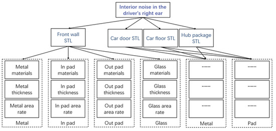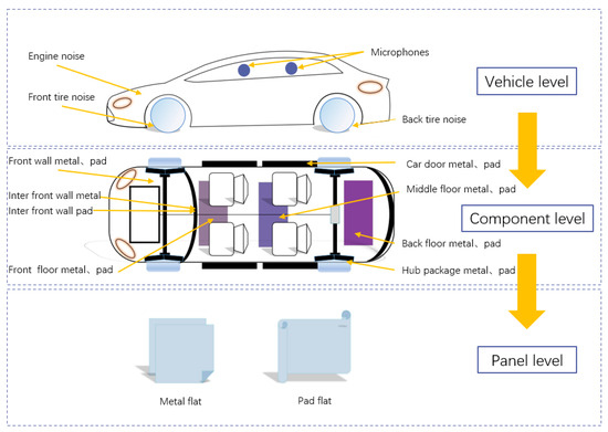 At present, interior noise is mainly controlled by applying acoustic packets on the noise transmission path. The acoustic package component is a multi-layer composite packaging structure with sound absorption and sound insulation performance [35]. Multiple acoustic packages are arranged in the front of the car, the door, the front, middle and rear floor carpets of the car floor, the car wheel hub package and other locations, which improves the sound insulation performance of the car body system. At the same time, the sound insulation problem of the body system becomes a comprehensive problem involving many unit components. Therefore, the analysis of the sound insulation performance of the body cannot only focus on the top-level performance indicators; it must also analyze the sound absorption and sound insulation performance of the unit components that make up the body system [36]. Hierarchical decomposition is an analytical method that combines theoretical analysis and practical engineering experience. By decomposing the overall technical indicators into components step by step, the design influencing factors hidden under the hierarchy are found [37]. The premise is to reveal the quantitative relationship between the related unit indicators in the hierarchical system. The prediction of the sound insulation performance of the vehicle body system must rely on the analysis of the noise transmission path in the vehicle to define the unit components closely related to the sound absorption and insulation performance of the vehicle body system. According to the order of ‘vehicle level’, ‘component level’, and ‘panel level’, the quantitative indexes of the sound absorption and insulation performance of each level unit are determined and correlated from top to bottom, and the decomposition framework of the sound insulation performance prediction of the vehicle body system is established. The vehicle level represents the path sound insulation performance: the noise source to the noise attenuation of the receiving point. The component level represents the sound absorption and insulation performance of the sheet metal and sound insulation pad of the front, door, floor and hub package. The panel level represents the sound absorption and insulation performance of the sheet metal and sound insulation pad of each plate, as shown in Figure 3.