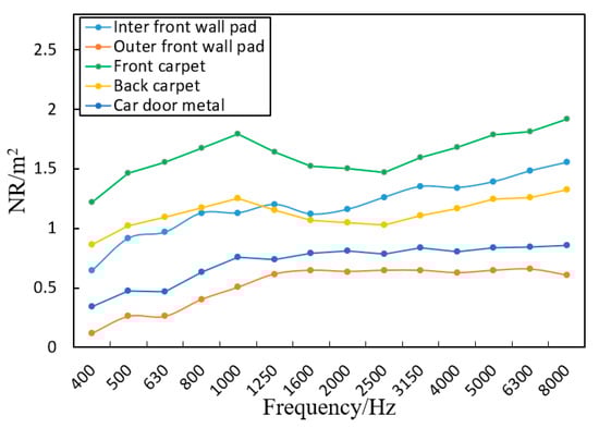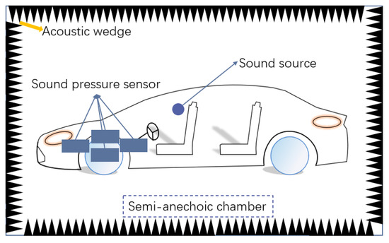 The sound insulation performance of the vehicle uses the noise attenuation (NR) from the noise source to the receiving point as the performance evaluation index. The noise attenuation is used to describe the propagation path, that is, the sound wave attenuation from the noise source to the receiving point. The vehicle sound insulation test is shown in Figure 6. The test vehicle was placed in a semi-anechoic room. In order to better simulate the sound transmission process, the noise sources at the noise receiving point were exchanged (that is, the volume sound source was arranged at the noise receiving point, and the sound pressure sensor was arranged at the noise source position). Four sound pressure sensors were arranged on the front, rear, left, and right sides of the four tires of the car, and the right ear side of the driver or passenger closest to each wheel was used as the noise receiving point for testing and data collection. Equation (11) was used to calculate the noise attenuation of the vehicle.