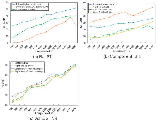 The plate-level sound insulation performance test tests the flat plates of different materials and thickness combinations. The transmission loss of a flat plate of a specific material and thickness combination is measured with an impedance tube test. The green curve in (a) is the transmission loss of the combined flat plate of the EVA plate with a thickness of 3 mm and the PU plate with a thickness of 15 mm. The component-level sound insulation performance test tests different components and measures the transmission loss of each component using the ‘reverberation chamber-semi-anechoic chamber window’ test. The green curve in (b) is the transmission loss of the inner front enclosure sound insulation pad measured with the test. The vehicle-level sound insulation test tests different paths and measures the noise attenuation of a certain path by placing the real vehicle in a semi-anechoic chamber. The green curve in (c) is the noise attenuation during the transmission process of the left rear wheel-left rear passenger.