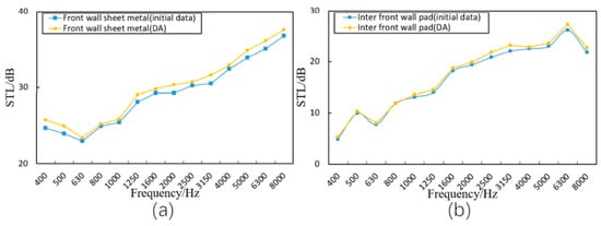Based on the test method, a total of 15 groups of body acoustic package sound absorption and insulation samples were collected. One group of front system sample information is shown in Table 2, and other system information is similar. The number of sample data obtained from the experiment was not enough to obtain a good training model and prediction results. The existing data set was expanded using DA (Data Augmentation) [42,43], adding random noise, random fluctuations, etc., to generate some extended data containing the existing data features, thereby increasing the number of samples, eliminating the common machine learning problem of over-fitting caused by a small data set training model [44], and improving the model effect and prediction results.