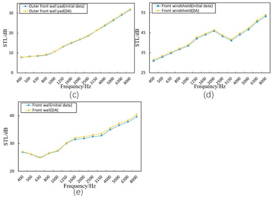 Figure 9 is a comparison chart between a set of data enhancement samples and the original samples. A set of front data includes five groups of samples: front system, front sheet metal, inner front sound insulation pad, outer front sound insulation pad, and front windshield. The data augmentation in this paper obeys the beta distribution (α β 2), λ [0, 1]. The smaller the λ value, the larger the sample data generated with interpolation, and vice versa. The closer the two sets of randomly selected sample data values are, the closer the new data generated with the Mixup method is to the original sample value. As (a) the front sheet metal data enhancement sample and the original sample comparison diagram shows, the new data generated with data enhancement is consistent with the overall trend in the original data, but there is no (c) external sound insulation pad data enhancement sample in the original sample comparison diagram. The effect is good, probably because (b) the two groups of samples randomly selected are compared with (a) the two groups of samples randomly selected and (b) the data values of each frequency point of the two groups of samples are closer.