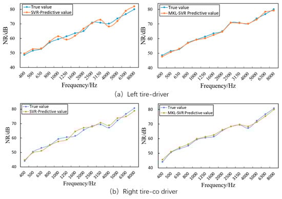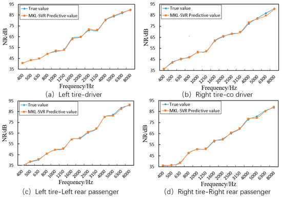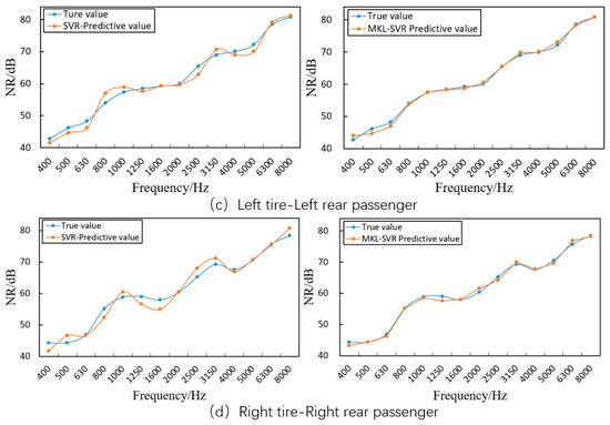 Using the MKL-SVR model constructed in Section 4.2, the target prediction of the plate level, system level, and vehicle level was carried out from bottom to top for the sound insulation system of the vehicle body. Finally, the corresponding prediction results were obtained along the noise transmission path in the vehicle. The results of vehicle-level noise attenuation are shown in Figure 11. Among them, the ‘MKL-SVR predicted value‘ is the predicted result under the multi-core learning mode, and the data collected from the vehicle sound insulation performance test of the series ‘prototype’ is the ‘true value’. The accuracy of the model prediction results was tested. From Figure 11, it can be seen that for (a) the left front wheel—driver, (b) the right front wheel—co-driver, (c) the left rear wheel—left rear passenger, (d) the right rear wheel—right rear passenger, the left side of each vehicle path is the comparison chart between the single-core SVR and the true value, and the right side is the comparison chart between the MKL-SVR and the true value. It can be clearly concluded that the predicted values of the MKL-SVR model and the SVR model of the noise attenuation are consistent with the linear trend in the real value. On this basis, the prediction results of the SVR model in the MKL mode were compared with the prediction results of the single kernel SVR model. The prediction results of the MKL-SVR model not only have a higher degree of coincidence with the real value trend but also have better accuracy.