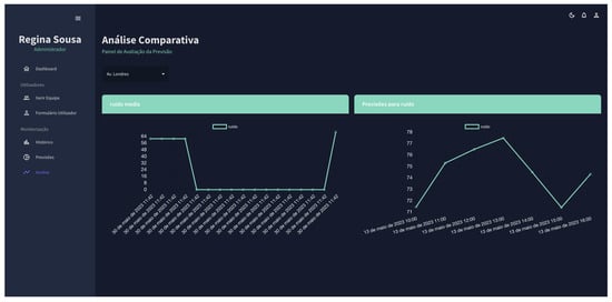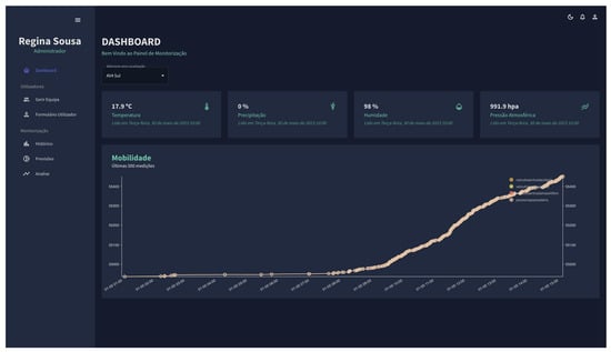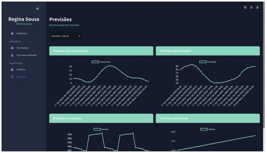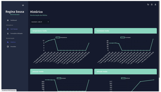 The primary audience for the web application is urban corporations so that they can manage and monitor the data collected by the installed sensors in real time. The platform was built using ReactJS and NodeJS, with data from the API described in Section 3.1. The choice of ReactJS and NodeJS brings several benefits to the platform. Firstly, ReactJS ensures an efficient and responsive user interface, providing a smooth user experience, which is crucial for urban corporations that require real-time data monitoring. Additionally, NodeJS offers non-blocking I/O operations, which can significantly enhance the platform’s overall performance, especially when dealing with real-time data. Furthermore, ReactJS and NodeJS are highly scalable technologies, capable of accommodating a growing number of sensors and data points over time. Their extensive developer communities provide access to a wealth of resources, libraries, and third-party modules, making it easier to address evolving needs and maintain the platform effectively. By accessing this platform, the offices responsible for administering and monitoring history and predictive analysis will discover three monitoring screens, each with a distinct function.
