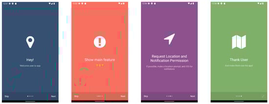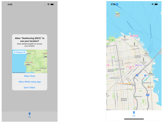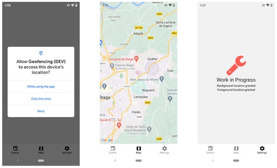 Figure 7 shows Android users moving from left to right, and it shows the Android request to access the user’s location, the main screen of the application with the city map and active geofences (with the map provided by Google Maps and the geofences retrieved from the Firestore database), and finally, the settings screen where the user can check if all location permissions are granted.