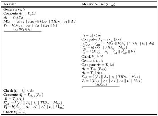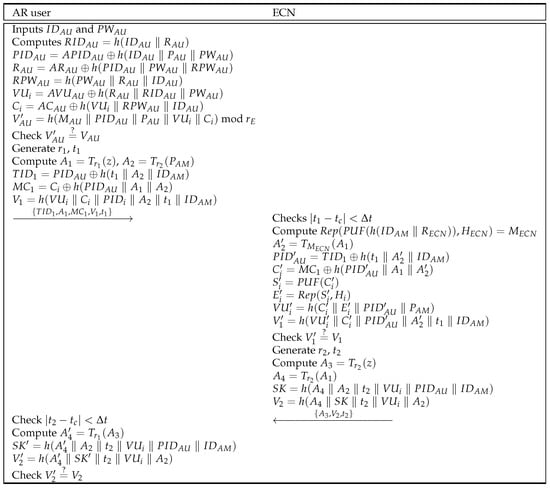 - The AR user checks and computes , , and . If , the session key is completely agreed.