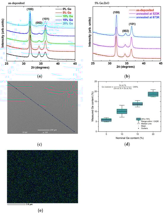 XRD patterns of (a) Ge:ZnO thin films after deposition at 473 K. (b) Influence of annealing at 523 K and 673 K on XRD patterns of 5% Ge:ZnO. (c) Example of the EDS analysis along the line. (d) Nominal and measured Ge content based on EDS results. (e) EDS mapping of the surface of the 15% Ge:ZnO sample.