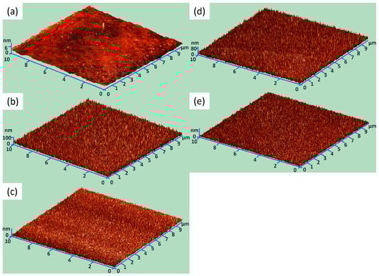 As mentioned earlier, SEM analyses (see Figure 1c) do not reveal any morphological details. Therefore, AFM analyses were performed. The obtained opacity is shown in Figure 2. All recorded images represent an area of 10 × 10 µm. The Z axis represents height in nm. Figure 2a shows the topography of pure silicon used as a substrate. Then, Figure 2b,c show the topography of 5% Ge:ZnO before and after annealing, respectively. The next two drawings, i.e., Figure 2d,e, show the topography of 15% Ge:ZnO before and after annealing, respectively.