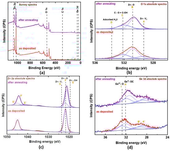 The bonding nature of the atoms was studied using XPS. The total concentration of the elements at the sample surface was measured with the survey spectra shown in Figure 2a, and the absolute spectra of each constituent element, i.e., Zn 2p, O 1s and Ge 3d in the compound are shown in Figure 2b–d. Table 3 shows the percentage composition of all the elements present in the survey spectra. Considering the energy of the probing beam, the composition of the film is obtained from the first 5–10 nm of the surface. The different components in each peak obtained after peak fitting correspond to different chemical states of that particular element, and the peak assignments of these states were undertaken according to the databases [,].