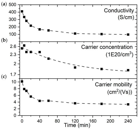 To establish the annealing time needed to achieve equilibrium state, eight samples of 5% Ge:ZnO thin films from one deposition batch were annealed in dry air flow at 523 K for different times ranging from 5 min to 4 h. The results of electrical measurements, i.e., conductivity, carrier concentration and mobility, indicate rapid changes in the first 40 min of annealing. The equilibrium state under the annealing conditions was reached after approximately 2 h (Figure 4). After this time, the properties remained constant in time within reasonable measurement uncertainty. Based on the observed behavior, the final time of annealing was set to 4 h to ensure proper stabilization of the sample.