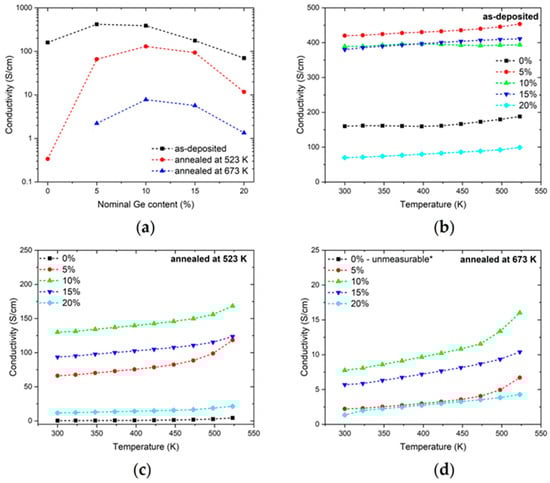 (a) Room-temperature conductivity of as-deposited and annealed samples as a function of nominal Ge content. The temperature dependency of the conductivity of (b) the as-deposited sample and (c) the sample annealed in dry air flow at 523 K or (d) 673 K. Dashed lines serve as guides for the eye. * The measurement of the undoped sample annealed at 673 K was invalid due to the sample resistance of the instrument being too high.