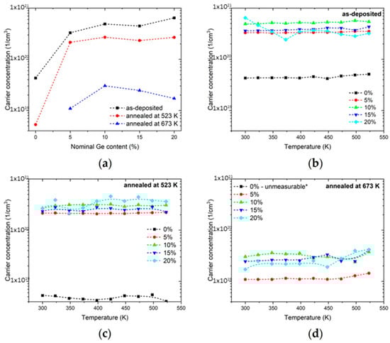 (a) Room-temperature carrier concentration of as-deposited and annealed samples as a function of nominal Ge content. The temperature dependency of the carrier concentration of (b) the as-deposited sample and (c) the sample annealed in dry air flow at 523 K or (d) 673 K. Dashed lines serve as guides for the eye. * The measurement of the undoped sample annealed at 673 K was invalid due to the sample resistance of the instrument being too high.
