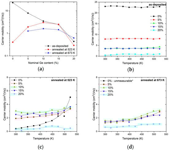 (a) Room-temperature carrier mobility of as-deposited and annealed samples as a function of nominal Ge content. The temperature dependency of the carrier mobility of (b) the as-deposited sample and (c) the sample annealed in dry air flow at 523 K or (d) 673 K. Dashed lines serve as guides for the eye. * The measurement of the undoped sample annealed at 673 K was invalid due to the sample resistance of the instrument being too high.
