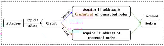 Figure 1. The attacker acquired essential attack information from the client PC and proceeded to initiate a sequence of attacks aimed at infiltrating and gaining control over the target PCs. The simulation concluded when the attacker successfully compromised all PCs within the network environment. This approach allowed for a controlled and systematic examination of cyber-attack dynamics, providing valuable insights into the vulnerabilities and potential security breaches within the simulated network.