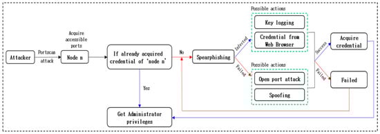 Table 2. (1) Try port access through open ports, (2) spoofing login by impersonating an authorized PC’s IP address, (3) key logging to obtain credentials when keyboard security is not in place, and (4) accessing web-stored credentials. First, choose an exploit attack to target the vulnerability of the PC object and use a port scan to find open ports to attack the target PC object. The attacker uses four attributes as the state: the number of connected nodes and open ports discovered in the previous attacks, the presence of keyboard security, and the presence of web credentials. Based on the current state, the attacker selects the most rational action to attack the target PC.