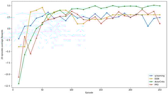 Table 3. Once trapped in such minima, performance persists even with continued training unless the algorithm successfully extricates itself. Conversely, the actor–critic algorithm, a policy-based approach, exhibits robust performance in the experiment by enabling more flexible decision-making compared to value-based algorithms such as Q-learning and DQN.