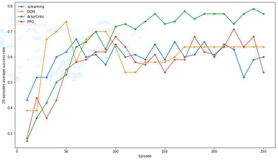 In the preliminary phase of training, specifically at 50 episodes, the DQN algorithm manifests the highest average success rate, registering at 0.72, surpassing the rates of 0.61, 0.53, and 0.52 for Q-learning, actor–critic, and PPO, respectively, as detailed in
