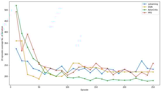 Table 5, the actor–critic algorithm emerges as the most efficient, demanding the fewest iterations—171—to conclude an episode, in contrast to Q-learning, DQN, and PPO, which necessitated 240, 223, and 262 iterations, respectively. The constraints on the DQN algorithm’s performance stem from its vulnerability to local minima, impeding effective performance enhancement. Additionally, the intrinsic value-based nature of the DQN algorithm engenders a dearth of diversity in its actions, consistently opting for the action with the highest cumulative reward value. This proclivity restricts its capacity to explore alternative strategies, further limiting its adaptive capabilities.
