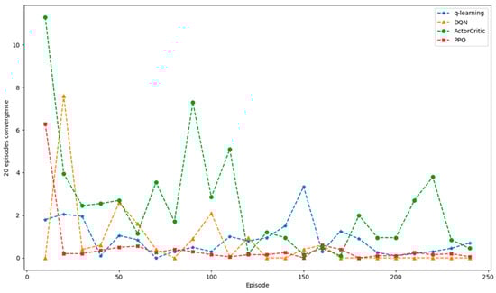 Table 6, the Q-Learning starts with a convergence measure of 1.89 at episode 20, drops to its lowest at episode 100 with 0.39, peaks significantly at episode 150 to 3.52, and then decreases again, reaching 0.56 by episode 250. DQN has no convergence measure at episode 20, which could indicate it started with optimal performance or the metric was not recorded. The performance worsens by episode 50 with a value of 2.74, slightly decreases by episode 100, and then improves considerably, reaching its best performance by episode 250 with a convergence measure of 0.14. The DQN shows a trend of improvement over time, implying that it might be more stable and learn more effectively as more episodes are completed. The actor–critic has the highest initial convergence measure at episode 20 with 11.3, suggesting a poor start compared to the others. However, it shows an improvement by episode 50, a slight increase by episode 100, and then a substantial improvement, reaching its lowest convergence measure at episode 150 with 0.47. The value goes up again at episode 200 and then drops by episode 250, indicating some volatility but overall trending towards better performance. Lastly, PPO begins with a convergence measure of 6.3 at episode 20, improves rapidly by episode 50, and continues to improve or maintain a low convergence measure throughout the remaining episodes, ending with 0.16 by episode 250. PPO demonstrates stable and consistent improvement out of all the algorithms, suggesting it is effective at learning and adapting over time with minimal performance fluctuations.