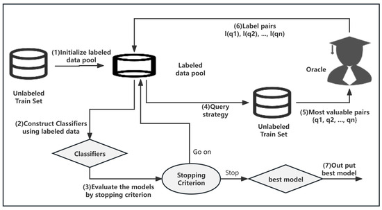 The proposed active learning method for entity matching adopts the pool-based query strategy, the process of which is shown in Figure 2. Firstly, select a small number of valuable samples from the unlabeled training samples for labeling, i.e., construct the initial labeled pool. Then, construct the initial classifiers by labeled samples. If the performance of classifiers meets the requirements of the stop criterion, output the optimal classifier, otherwise, calculate the uncertainty of each sample from the unlabeled training set, select n samples with the most uncertainty for labeling according to the query strategies, and add these labeled samples to the labeled pool. Repeat the above steps until the classifier meets the requirements of the stop criterion. In each iteration, the label-request will be put forward actively, and the most valuable samples will be selected and handed over to experts for labeling to maximize the benefit of the experts’ work. We can assume that the labels given by the experts are ground truth.