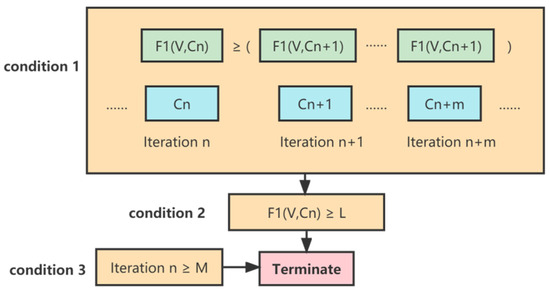 The stop criterion is shown in Figure 5. We use each intermediate classifier to predict the samples on validation set V. When the F1 (V, Ci) calculated by the classifier Ci in the i-th iteration on validation set V does not increase or even decrease, the iteration will be terminated. Due to certain deviations in each intermediate classifier, we usually continue the active learning process for more stable classifiers, that is, if the F1 score does not increase after successive iterations, the classifier Ci with the highest F1 score will be outputted. In addition, we need to set a minimum threshold L according to the result of other baseline methods. If the F1 score predicted by classifiers on the validation set V is lower than L, we will continue the iteration regardless of the stop criterion. This strategy can ensure that the result of active learning will not be too poor, and prevent the classifiers from stopping halfway before learning enough characteristics. Moreover, the F1 score of intermediate classifiers may increase constantly when the labeled data are added continuously. We set an upper limitation M of iteration to avoid the iteration being terminated too late. When the number of iterations reaches M, the iteration will be terminated regardless of the stop criterion, and the classifier Ci with the highest F1 (T, Ci) will be outputted. If the size | S | of the labeled data pool is too large, it does not attain the purpose of active learning, i.e., reducing the labeling workload. Therefore, the upper limitation M of iteration is usually not too large.