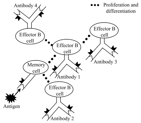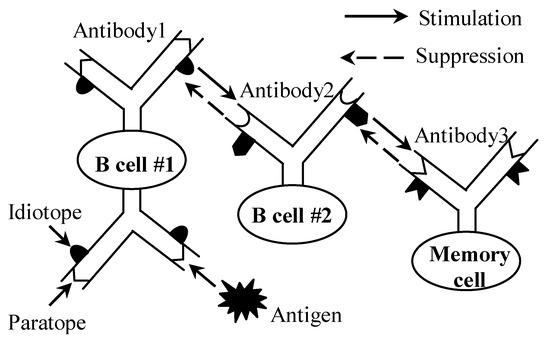 The biological immune system is a highly evolved, complex, and adaptable system capable of identifying and resisting antigenic foreign bodies, such as bacteria and viruses, while maintaining stability in an in vivo environment. The idiotypic network hypothesis [13] developed by Jerne in 1972 is one of the important immune theories. The idea of the hypothesis is schematically shown in Figure 1. The biological immune network involves a series of processes related to self-recognition and the elimination of differences [14]. When an antigen invades, the B cell whose paratope can identify the antigen is activated. Most of the activated B cells differentiate and produce antibodies to clear the antigen, while the others differentiate into memory cells. Through the identification of paratopes and idiotopes among multi-antibodies, a complex immune network is constructed to effectively cope with the invasion of foreign antigens.