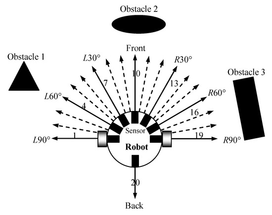 where e′ is coded by a binary value. is the detection result regarding obstacles in direction l. ∀ l ∈ {1, 2, …, 8}, , where the elements “0” and “1” represent “no obstacle” and “obstacle” in direction l, respectively. The string length, 8, of e′ depends on the number of distance-detection sensors.