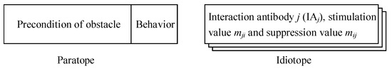 where is the paratope of primary immune antibody i. The term denotes the precondition of the obstacle, and its string length corresponds to the number of distance-detection sensors. ∀ l ∈ {1, 2, …, 8}, , where the elements “0” and “1” still denote “no obstacle” and “obstacle”, respectively. The element “#” denotes that the condition can be taken as either “0” or “1”. denotes the robot’s behavior (i.e., movement direction) and . The detailed definitions of the paratope, , are shown in Table 1. is the idiotope of ; IAj denotes the interaction with antibody . represents the stimulation value of on and mij represents the suppression value of on .
