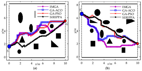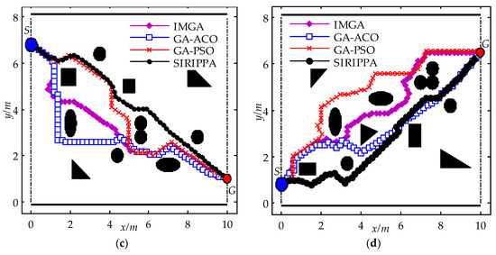 To verify the path planning performance of the SIRIPPA and considering the four different static environments, shown in Figure 6, selected simulation tests were performed firstly, and the planning results of the SIRIPPA were compared with those of the IMGA, GA-ACO, and GA-PSO. All the parameter values of the IMGA, GA-ACO, and GA-PSO were from the relevant literature. Figure 6 shows the planning results for the four immune algorithms.