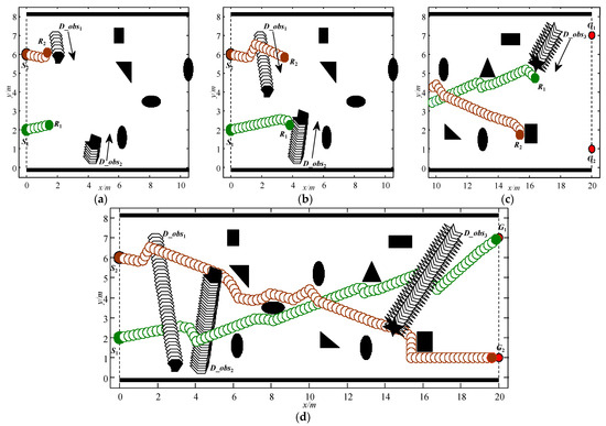 Path planning results of the SIRIPPA in a dynamic environment. (a) Avoid D_obs1; (b) avoid D_obs2; (c) avoid D_obs3; (d) achieve the goals.