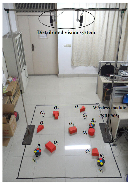 To further verify the validity of the proposed SIRIPPA in a real environment, an online dynamic planning experiment was performed. Figure 8 provides an experimental environment for the path planning of multi-robots, where there are three mobile robots (i.e., R1, R2, and Rd), seven static obstacles (i.e., O1, O2, …, O7), two overhead cameras, a wireless module, and a host computer. Two cameras were used as the global vision system to capture the environment of multi-robots, and the final global environment map was produced based on the image mosaic technique [16]. Figure 9 shows the designed mobile robot, which was driven in the differential mode by connecting two direct motors to two wheels. The mobile robot was equipped symmetrically, but unevenly, with five ultrasonic distance sensors and three infrared distance sensors around it. The ultrasonic sensor model was HC-SR04 and the infrared sensor model was GP2Y0A41SK0F. These sensors were primarily used for rapidly determining whether obstacles were present around the mobile robot. When both the ultrasonic and infrared sensors detected the absence of obstacles in the robot’s surroundings, the distributed vision system did not need to check for obstacle information in that direction. The distributed vision system was activated only when obstacles were detected within the sensor’s coverage area, allowing it to further confirm the specific direction and distance information of the obstacles. To obtain the accurate position and pose information, a color-label plate [17] was installed on the top of the robot, which consisted of one baseplate (black) and four color labels. Label 2 (blue) was the main color label. Label 3 was the auxiliary color label and its color could be red or yellow. The center coordinate of the main color label was defined as the robot coordinate. The direction of the vector between the middle auxiliary color label (i.e., label 3) and main color label (i.e., label 2) was defined as the forward direction of the mobile robot. Different robots could be distinguished according to the different color sequences of three auxiliary color labels. The localizations of three robots were realized based on two overhead cameras, shown in Figure 8.