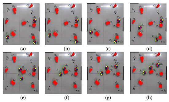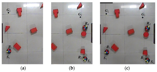Figure 10a,b show the left and right images captured by the two cameras. Figure 10c shows the whole working environment of the multi-robots after the image mosaic. The experimental requirements can be described as follows: robots R1 and R2 executed the online path planning from S1 and S2 to G1 and G2, respectively, using the proposed SIRIPPA. Robot Rd was considered a dynamic obstacle moving in the environment. All robots could wirelessly communicate with the host computer and receive control commands through the NRF905 wireless module.