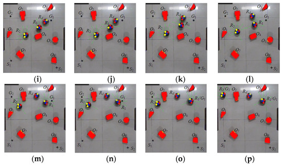 Experimental results of path planning based on the SIRIPPA. (a) t = 0 s; (b) t = 6 s; (c) t = 10 s; (d) t = 20 s; (e) t = 32 s; (f) t = 36 s; (g) t = 38 s; (h) t = 40 s; (i) t = 41 s; (j) t = 42 s; (k) t = 43 s; (l) t = 45 s; (m) t = 50 s; (n) t = 51 s; (o) t = 53 s; (p) t = 60 s.